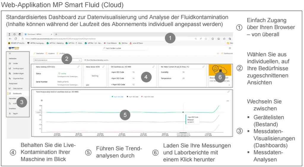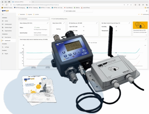Autarke Messwerterfassung des Inline Contamination Sensor der Marke MP Filtri sowie Funkübertragung an das Cloudportal MP Smart FluidProduktspezifikation